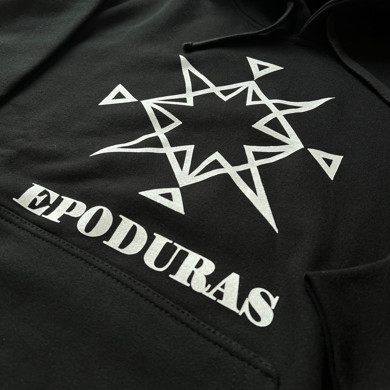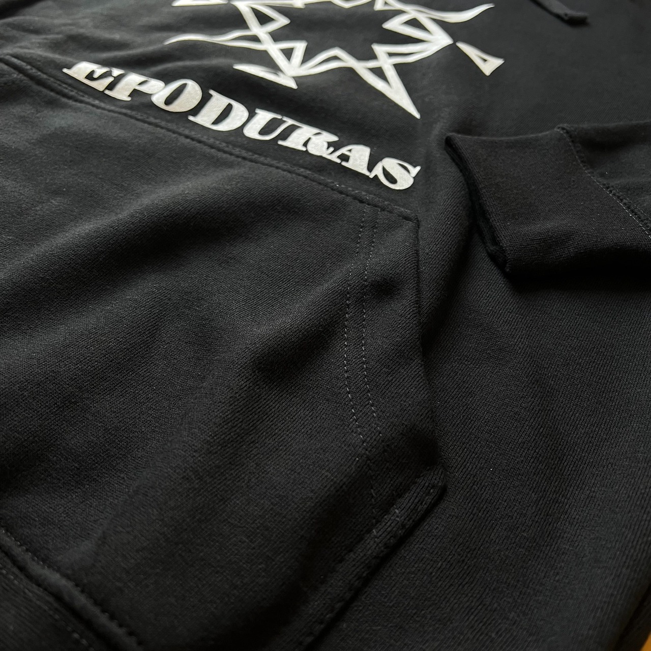 大きめのシルエットのパーカーに大きく落とし込んだデザイン。
